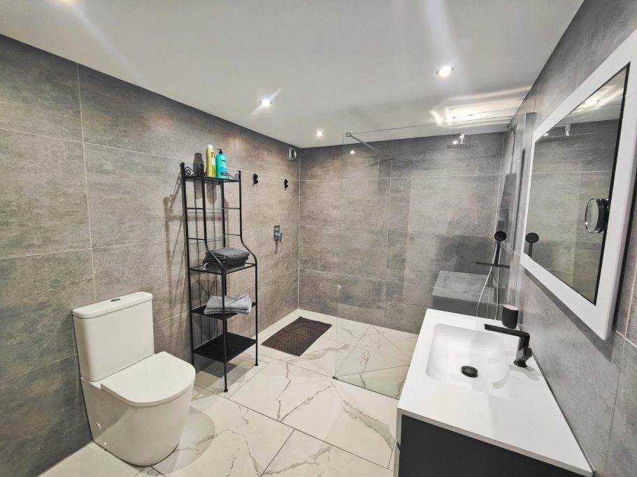 Une vaste salle de bain moderne complète l’espace.
