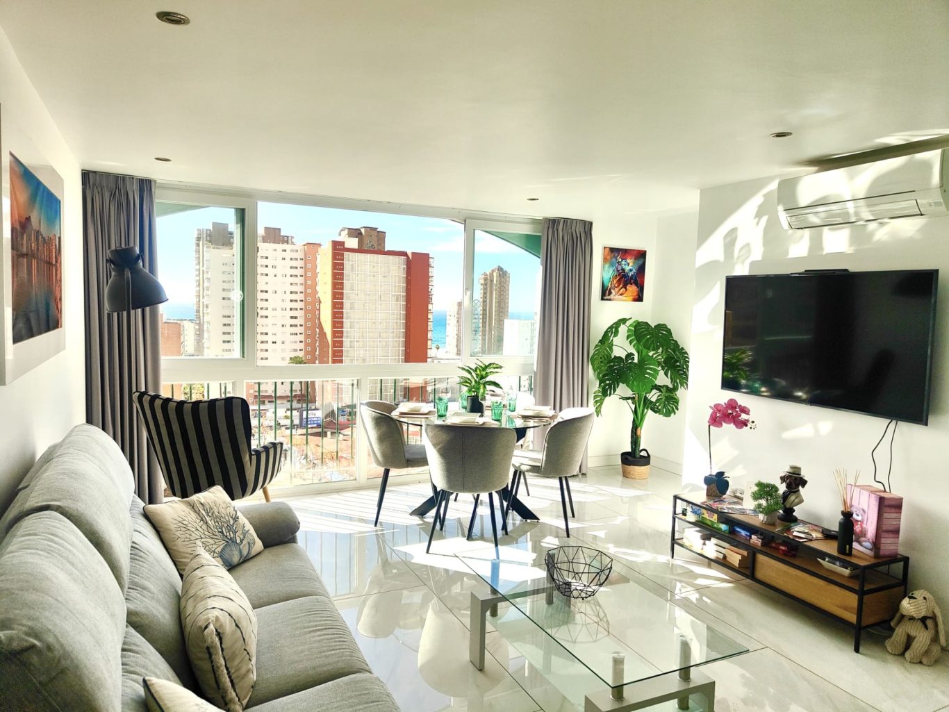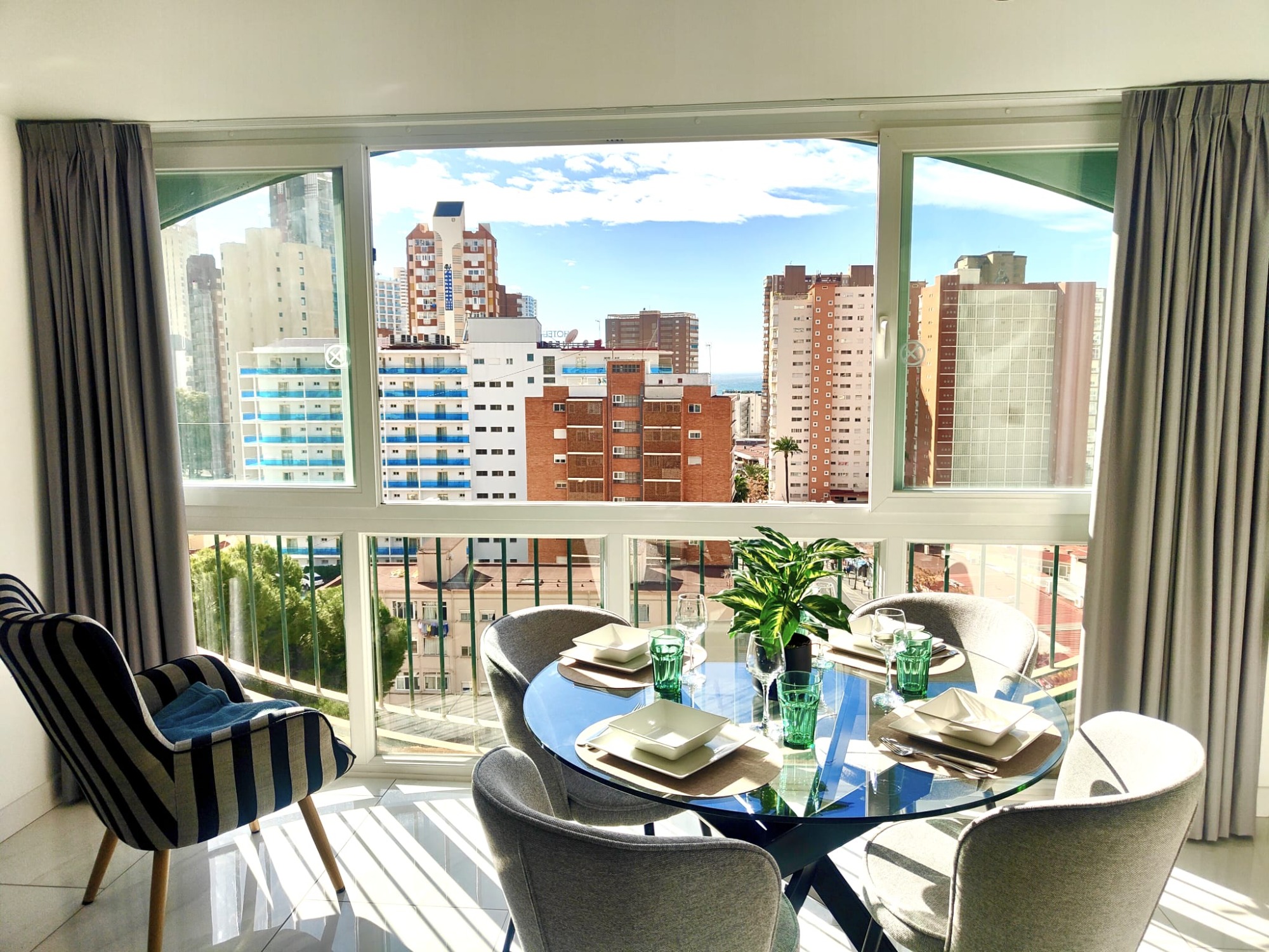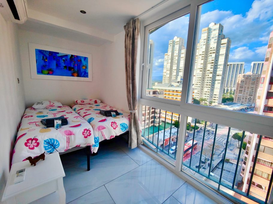 Cet appartement d’angle traversant situé au 9e étage bénéficie de nombreuses baies vitrées offrant des panoramas spectaculaires sur Benidorm s'étendant jusqu'à la mer.