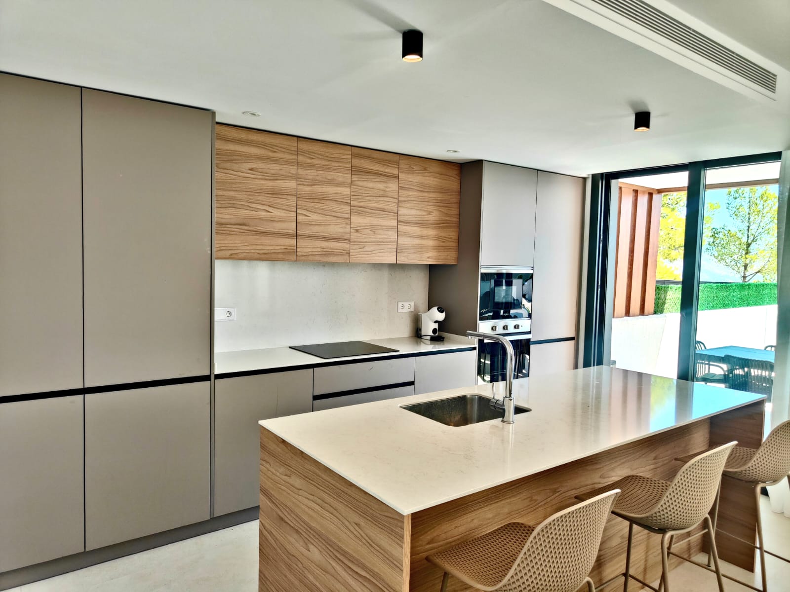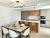 La cuisine ouverte avec îlot central est entièrement équipée, tandis que le salon élégant et l’espace repas offrent une vue agréable sur l’extérieur, créant un cadre convivial et raffiné pour vos séjours.