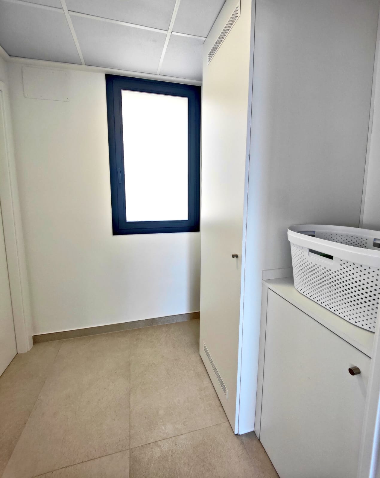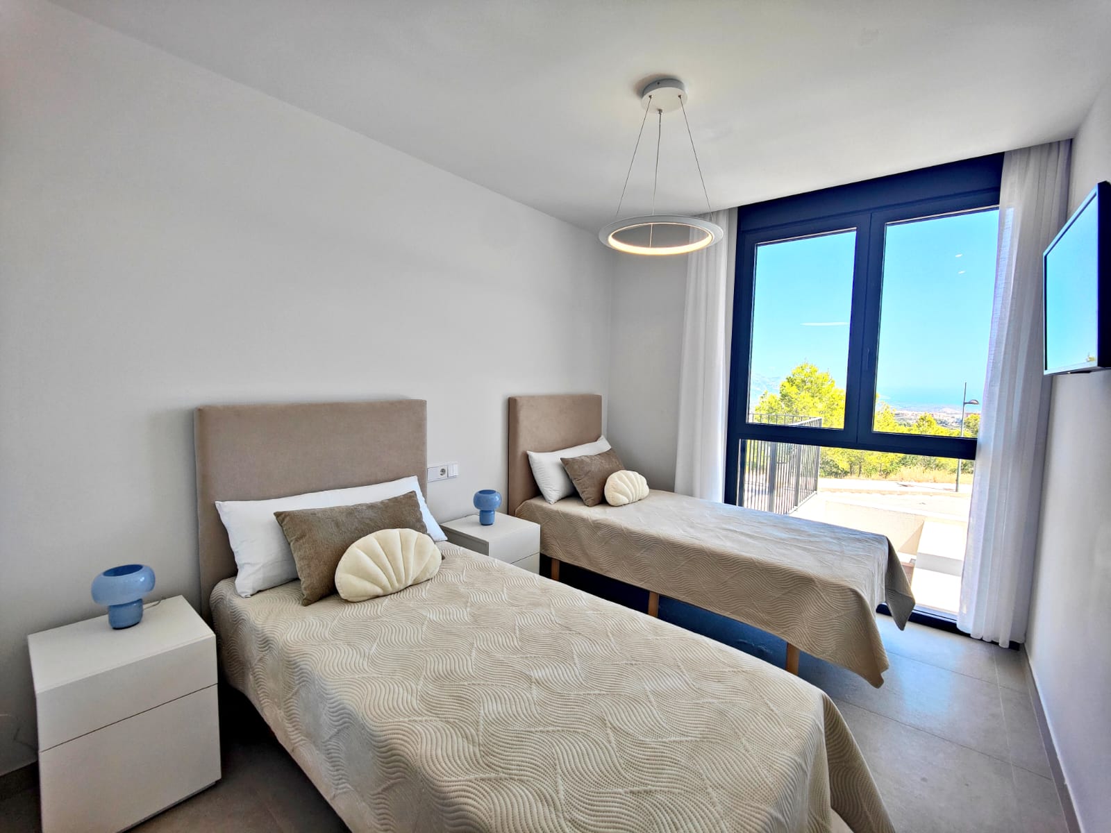 La deuxième chambre, élégante et lumineuse, dispose d’un lit Queen size, tandis que la troisième chambre, idéale pour les enfants ou invités, est équipée de deux lits simples. Ces deux chambres bénéficient de baies vitrées du sol au plafond et de grands placards intégrés, pour un confort optimal.