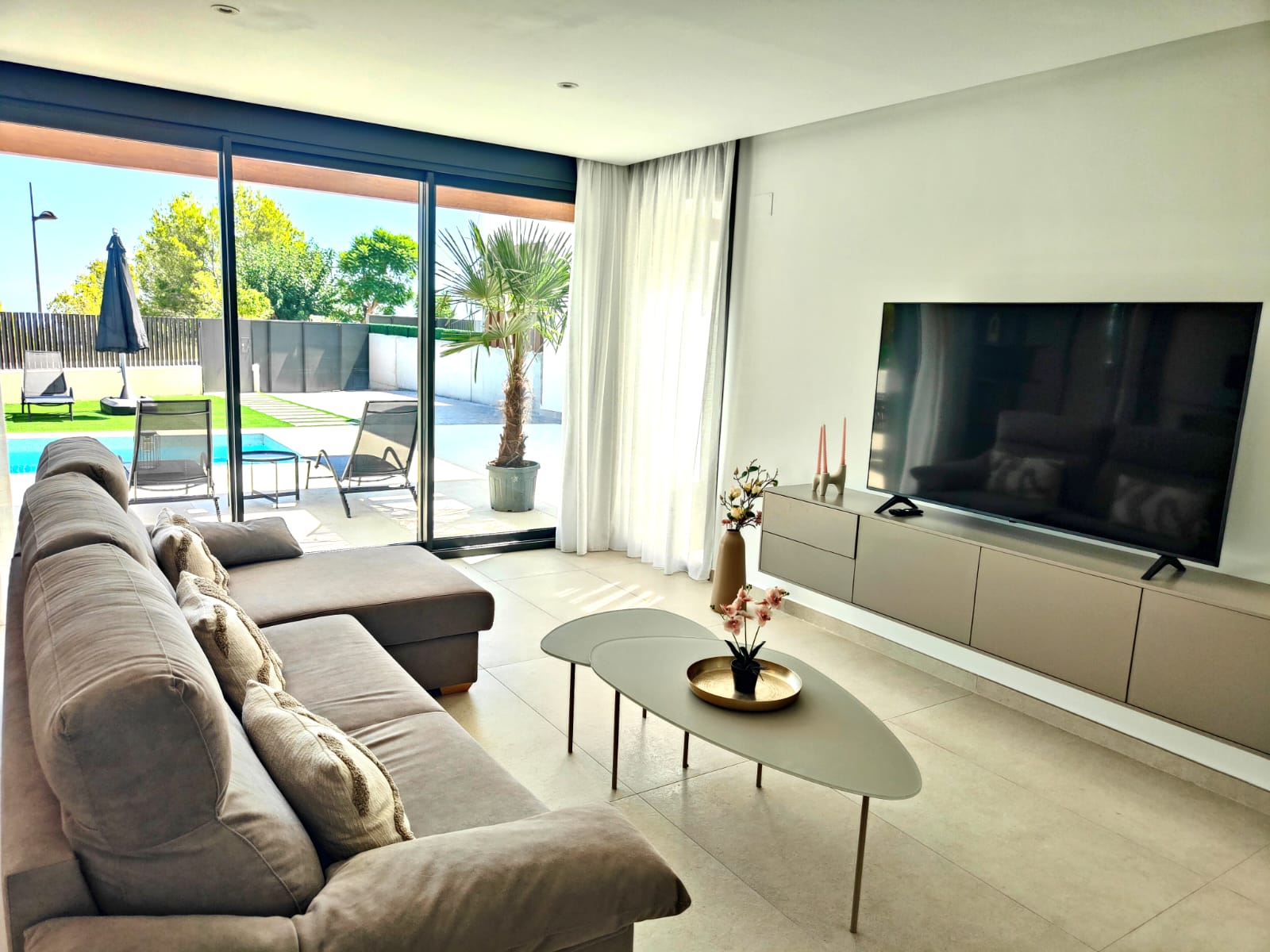 Achevée en 2025, cette villa allie confort, luminosité et décoration soignée au goût du jour. Sa grande pièce de vie climatisée de 45 m² s’ouvre directement sur la terrasse et la piscine.